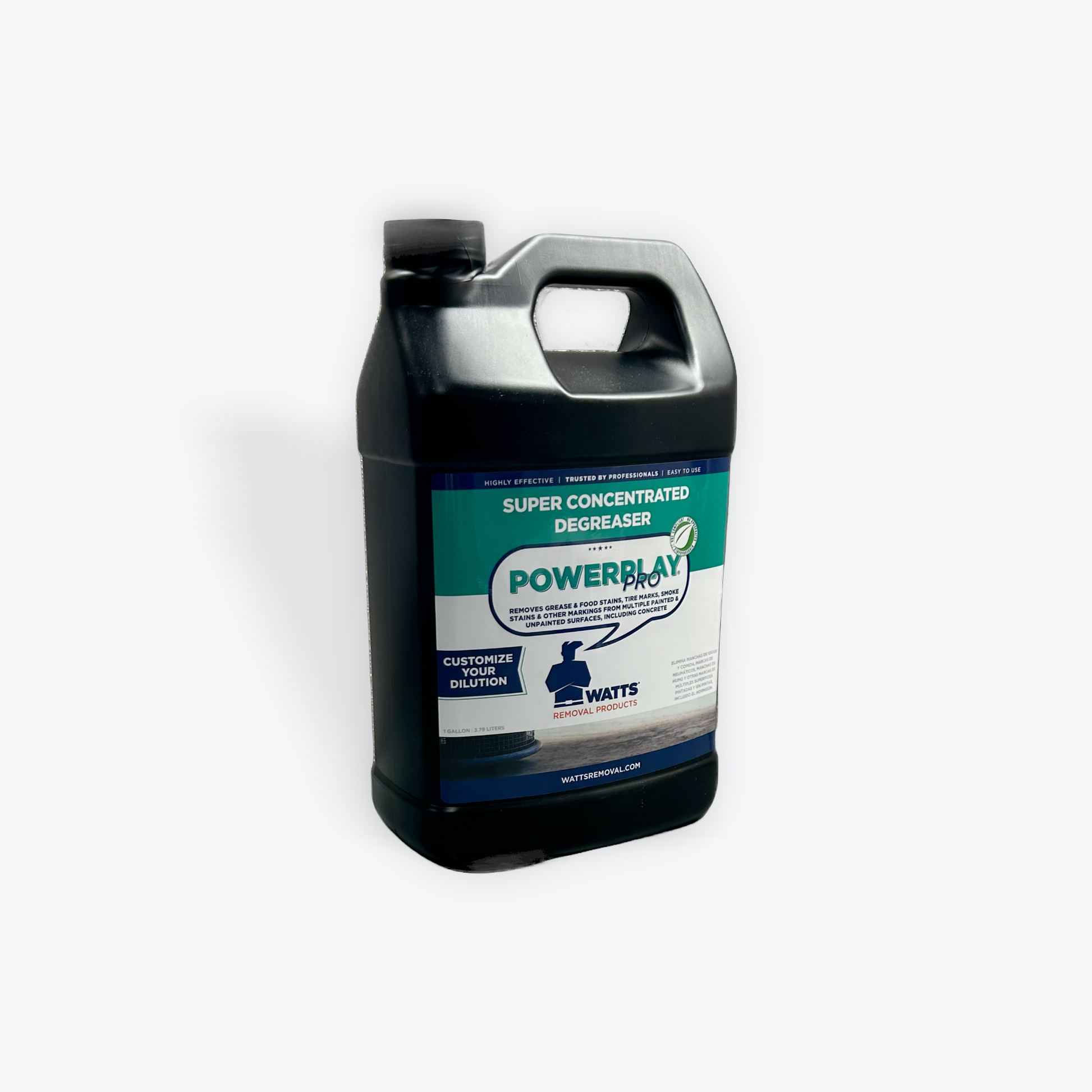PowerPlay® Pro is a highly effective, super-concentrated detergent designed to remove all types of stains, including oil, grease, food stains, as well as chalking & oxidation, from multiple painted and unpainted surfaces, vinyl siding, powder coating, metal roofs, painted fiber boards, concrete, brick, asphalt and more.